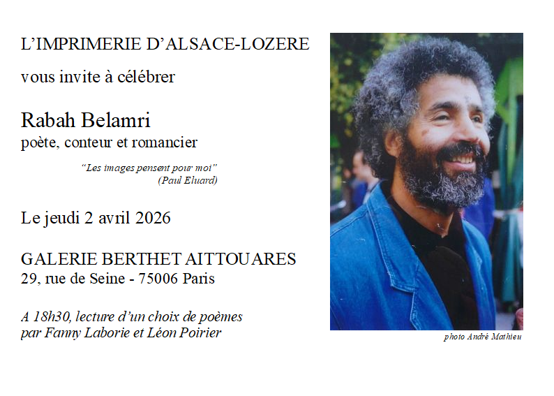 L’imprimerie d’Alsace-Lozère et la galerie Berthet-Aittouarès vous invite à célébrer Rabah Belamri, poète, conteur et romancier, disparu prématurément en 1995, à 49 ans. À l’occasion de cet hommage, seront exposés des portraits réalisés par Bernard-Gabriel Lafabrie, artiste, éditeur et ami du poète. Sera également lue une sélection de textes, mis en voix par Fanny Laborie, comédienne, et Léon Poirier, poète, dramaturge et musicien.